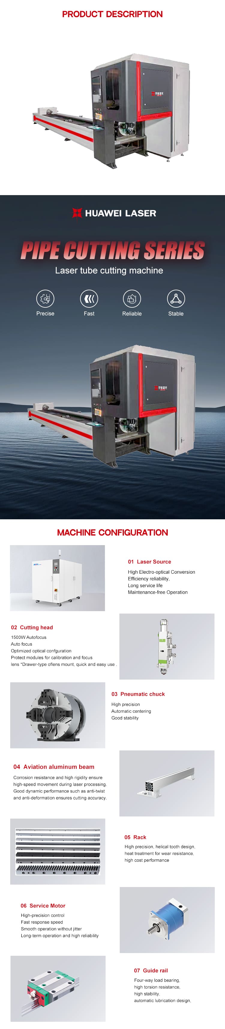 Высокоточный станок для лазерной резки труб с двойным патроном HUAWEI LASER 6000W предназначен для эффективной и точной обработки круглых, квадратных и нестандартных металлических труб. Его система с двумя патронами обеспечивает стабильный зажим, минимальную вибрацию и точное вращение во время высокоскоростной резки. Оснащенный высокопроизводительным источником волоконного лазера и интеллектуальным программным обеспечением управления, он обеспечивает чистый рез, гладкие края и превосходную повторяемость. Станок для лазерной резки труб с двойным патроном HUAWEI LASER — это усовершенствованная альтернатива ручному лазерному сварочному аппарату, разработанная специально для высокоэффективной обработки труб. Оснащенный двойными пневматическими патронами, он обеспечивает стабильный зажим, автоматическое центрирование и точное вращение для плавной и точной резки круглых, квадратных и нестандартных металлических труб. Его мощный источник волоконного лазера обеспечивает высокую скорость резки, чистые кромки и минимальную термическую деформацию. Система лазерной резки труб HUAWEI LASER, разработанная для обработки металлов, производства мебели, оборудования для фитнеса и автомобильных компонентов, обеспечивает исключительную точность, надежность и производительность для современного промышленного применения. Этот станок поддерживает автоматическую загрузку, оптимизированные траектории резки и быструю смену материалов, что делает его идеальным для производства мебели, оборудования для фитнеса, строительных труб и изготовления металлических изделий на заказ. Он обеспечивает высокую надежность и стабильную производительность при обработке труб.