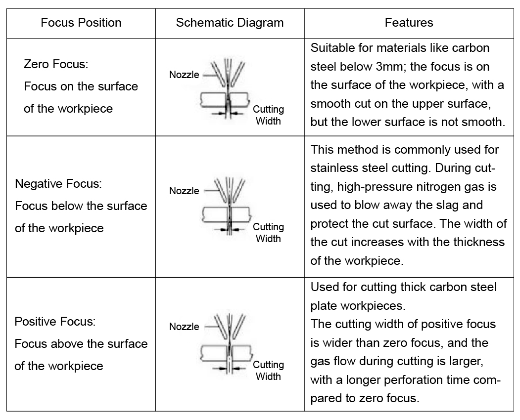 Средняя и толстая резка пластин:Для пластин средней толщины, чтобы обеспечить хорошее качество края, обычно используется негативное внимание. Основное внимание установлено глубже внутри материала, чтобы расширить разрез и улучшить поток газа и расплавленного материала, гарантируя, что достаточная плотность энергии применяется к области резания.
