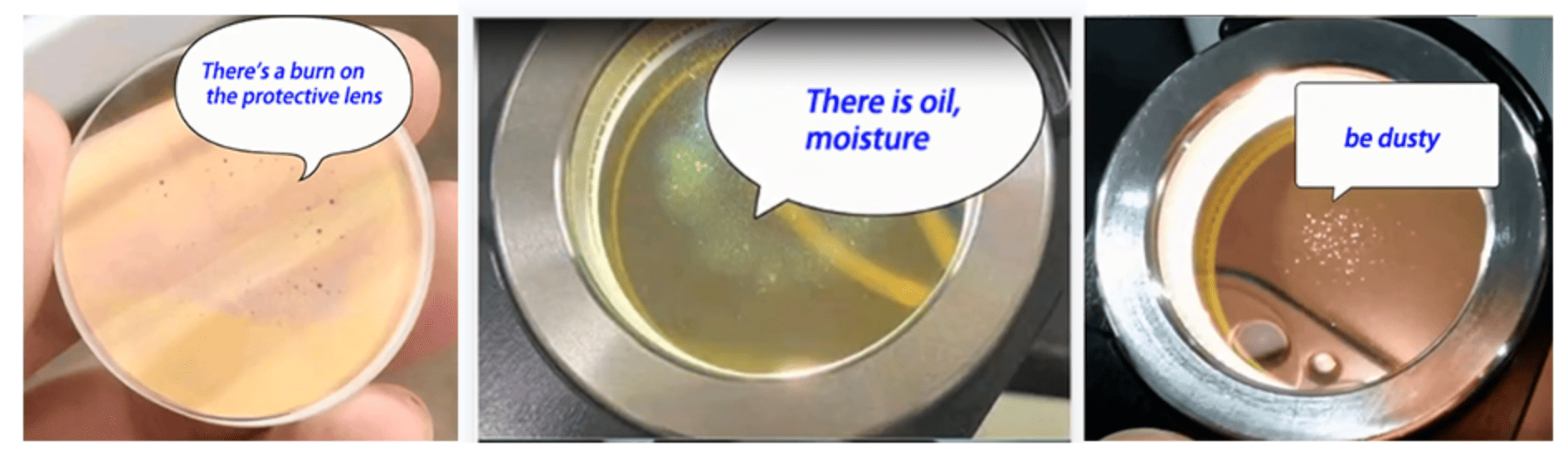 Проблемы с материалом и покрытием линзы: низкокачественные защитные линзы имеют плохую пропускную способность, поглощая больше лазерной энергии, что повышает температуру линзы и ускоряет повреждение.